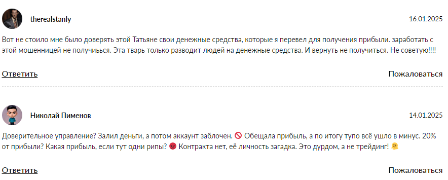 Татьяна всегда рядом — очень сомнительный проект. Обещания слишком высокой прибыли характерны для мошенников. Здесь это накладывается на полные непонятки со способом заработка: то ли передавать средства самой Татьяне для раскрутки через ее брокера, то ли торговать по сигналам на сторонней площадке. Инвестор сама не знает, с чем именно работает.