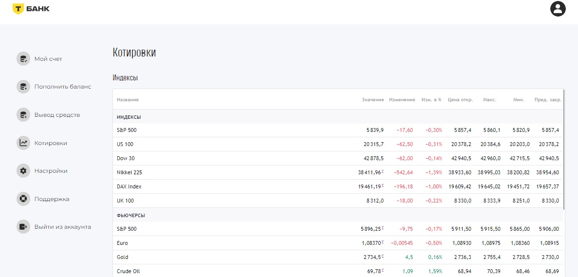 - Котировки — предоставлено очень ограниченное количество активов: индексы, фьючерсы, валютные пары (Форекс) — по 6 штук, облигации — 5.