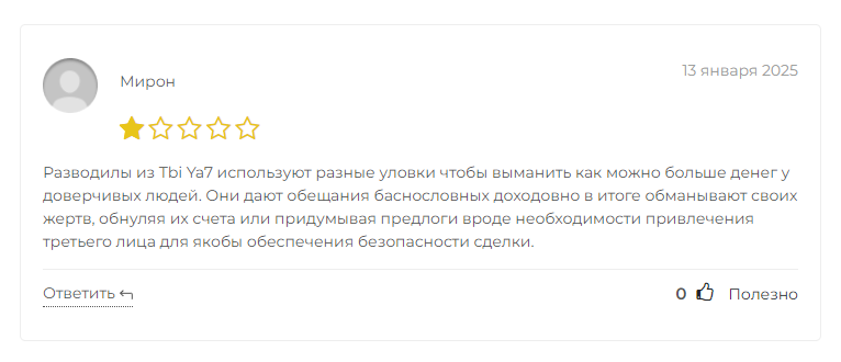 Мы не рекомендуем брокера tbi ya7 ввиду отсутствия лицензии, недостатка данных и негативных оценок. Сотрудничайте исключительно с проверенными площадками с высоким рейтингом.