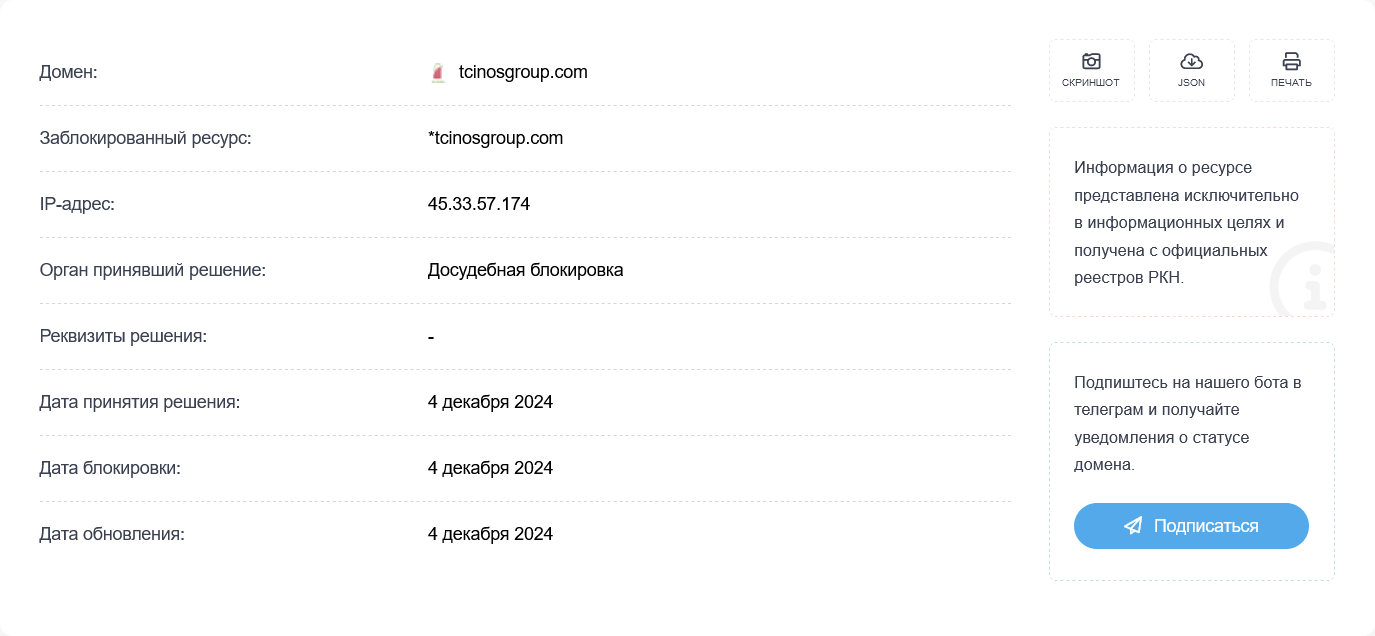 О брокере Tcinosgroup неизвестно ничего. На декабрь 2024 сайт заблокирован Роскомнадзором. Досудебная блокировка произошла 4.12.2024.