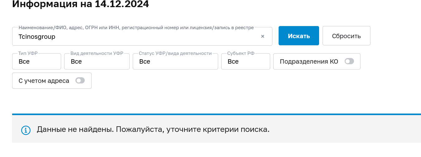 Сведений о регуляторах на сайте также не было. Но проверка показала, что лицензии ЦБ РФ у брокера Tcinosgroup нет.