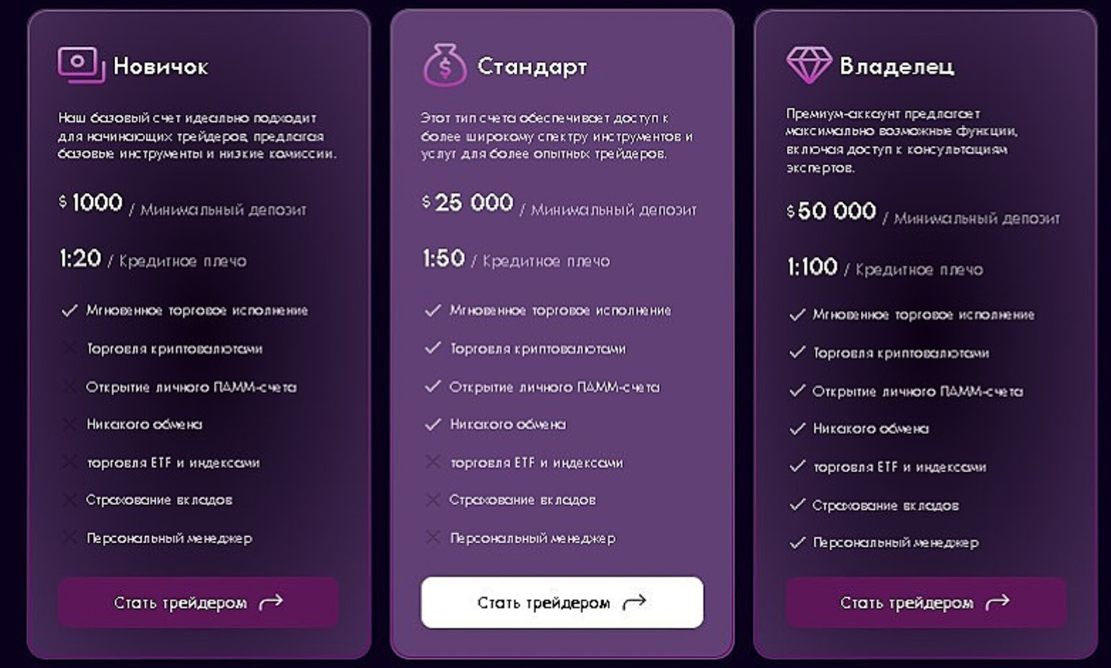 - Владелец. Порог входа 50 тыс. долларов. Предложено торговое плечо 1 к 100. Помимо стандартных возможностей, есть торговля индексами. Еще страховка и персональная поддержка менеджера.