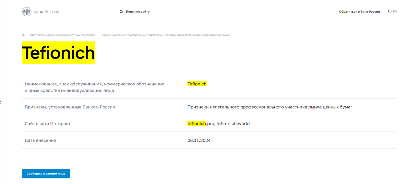 У брокерской компании Tefionich есть много сайтов-клонов. Проект занесен в черный список ЦБ РФ, из-за чего сотрудничать с ним крайне рискованно. Исходя из многочисленных жалоб трейдеров, с выводом средств происходят трудности. Основные минусы: