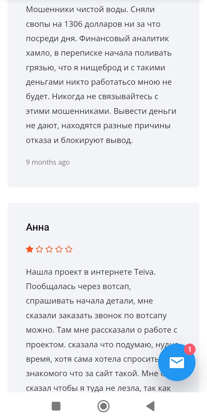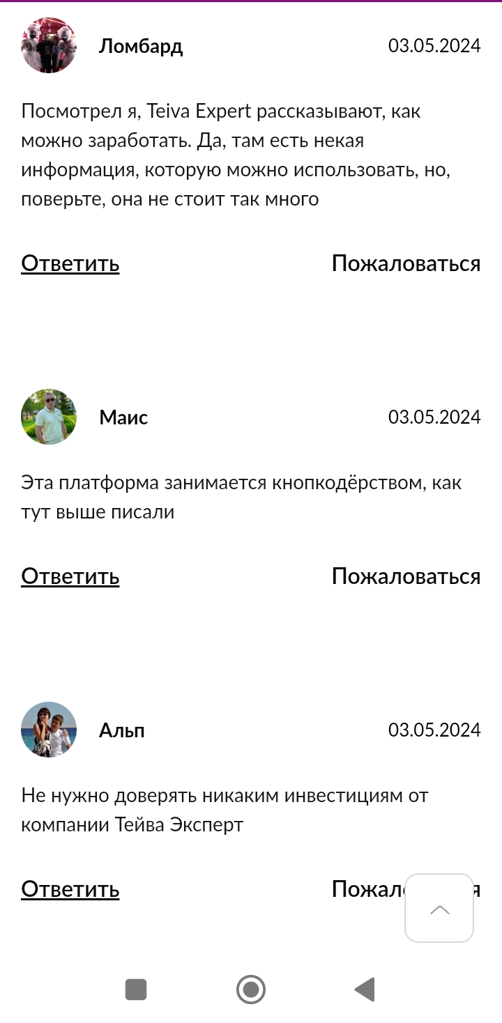 Отзывов о teiva expert на официальном сайте компании нет. На сторонних ресурсах их тоже мало. Это неудивительно, ведь разводят доверчивых инвесторов совершенно другие люди. И к ним пользователи предъявляют претензии. А о том, что за переход по партнерской ссылке «эксперты» из teiva получили свои проценты, многие забывают.