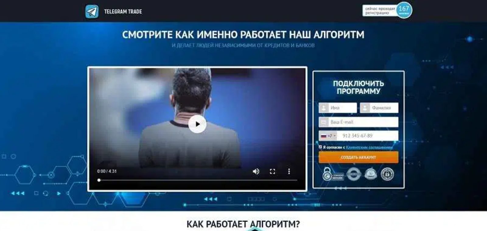 В прикрепленном на главной странице ролик, который должен объяснять принцип работы алгоритма, нет точных и четких данных о работе этой схемы. Просто указываются общие преимущества и положительные стороны. Такой подход нередко применяют мошенники, чтобы не давать пользователям конкретные данные. Стоит также отметить, что Telegram Trade, вполне возможно, не имеет непосредственного отношения к мессенджеру. Алгоритм может вовсе не подключаться ни к какой бирже или прочим местам торговли. В таком случае сервис просто принимает платежи и имитирует деятельность.На официальном сайте telegram-official com отсутствуют данные о регистрации компании, партнерах или регуляторах деятельности. Соответственно, работа ведется нелегально. Компания предлагает зарегистрироваться на сайте брокера 24NewsTrade. Данная площадка уже уличена в мошеннических действиях и получила много отрицательных отзывов.
