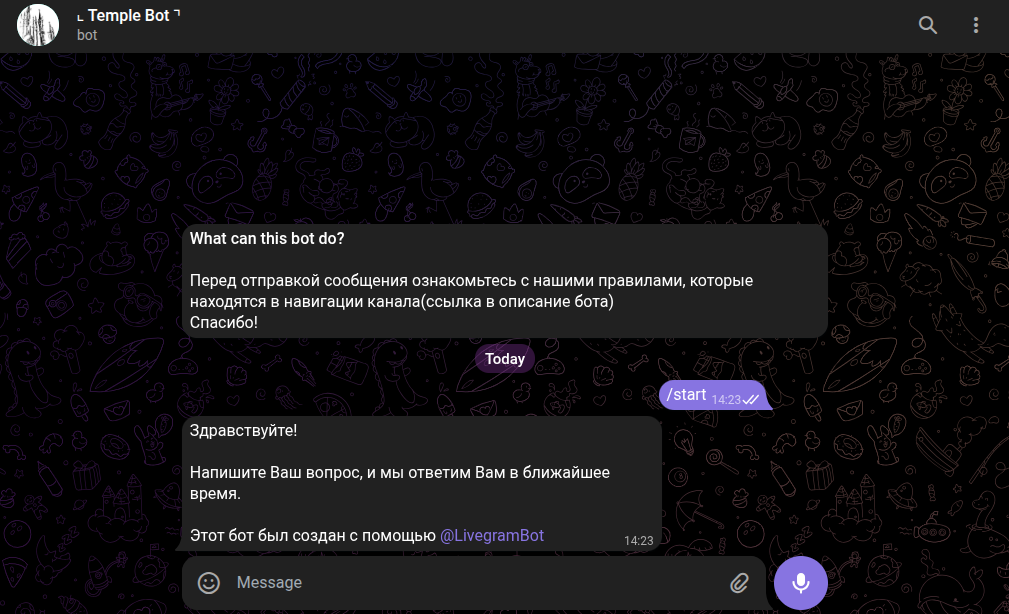 Стоит отметить, что после запуска бота больше нет никаких разделов в программном обеспечении. ПО предлагает задавать вопросы, ответы на которых даст один из свободных менеджеров. Больше кнопок для продолжения сотрудничества нет.