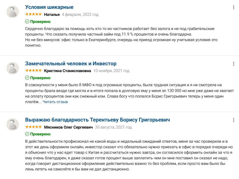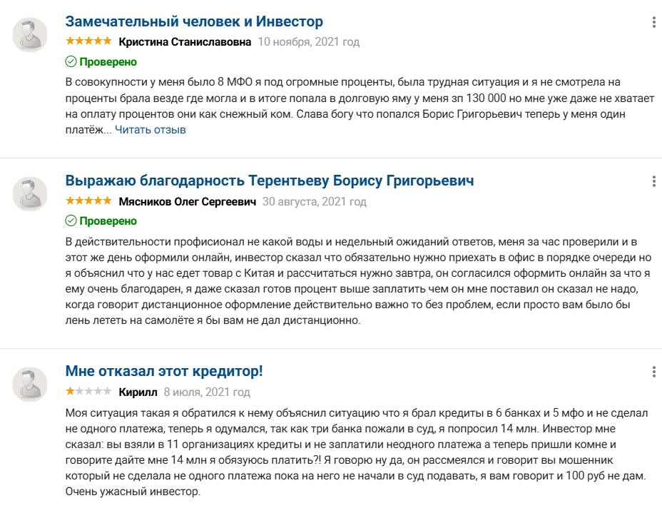 Чтобы понять, с кем мы имеем дело, предлагаем рассмотреть отзывы о Борисе Георгьевиче Терентьеве как об инвесторе и кредиторе.В сети есть множество откликов о его услугах. Клиенты отмечают как хорошие качества, среди которых есть отзывчивость и понимание, так и плохие. Рассмотрим сначала положительные отклики, а после негативные.