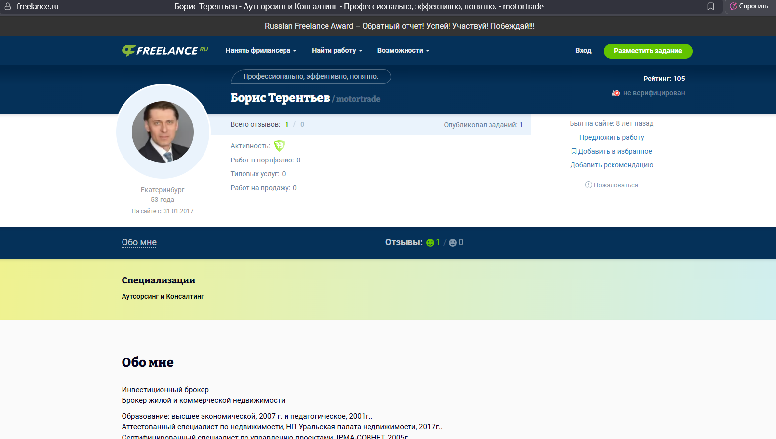 Профиль Бориса рассказывает о том, что он является инвестиционным брокером и имеет полномочия на деятельность, связанную с недвижимостью. Опыт работы – более 20 лет, имеет четыре образования.
