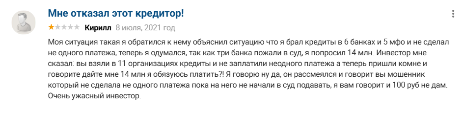 Бывают и плохие отзывы, но их мало. Например, однажды клиент по имени Кирилл записал разговор, где Борис ему отказал. Из отзыва видно, что Борис счёл клиента мошенником и в грубой форме отказал в займе. То есть он отказывает не просто так, а когда видит или подозревает нечестность.