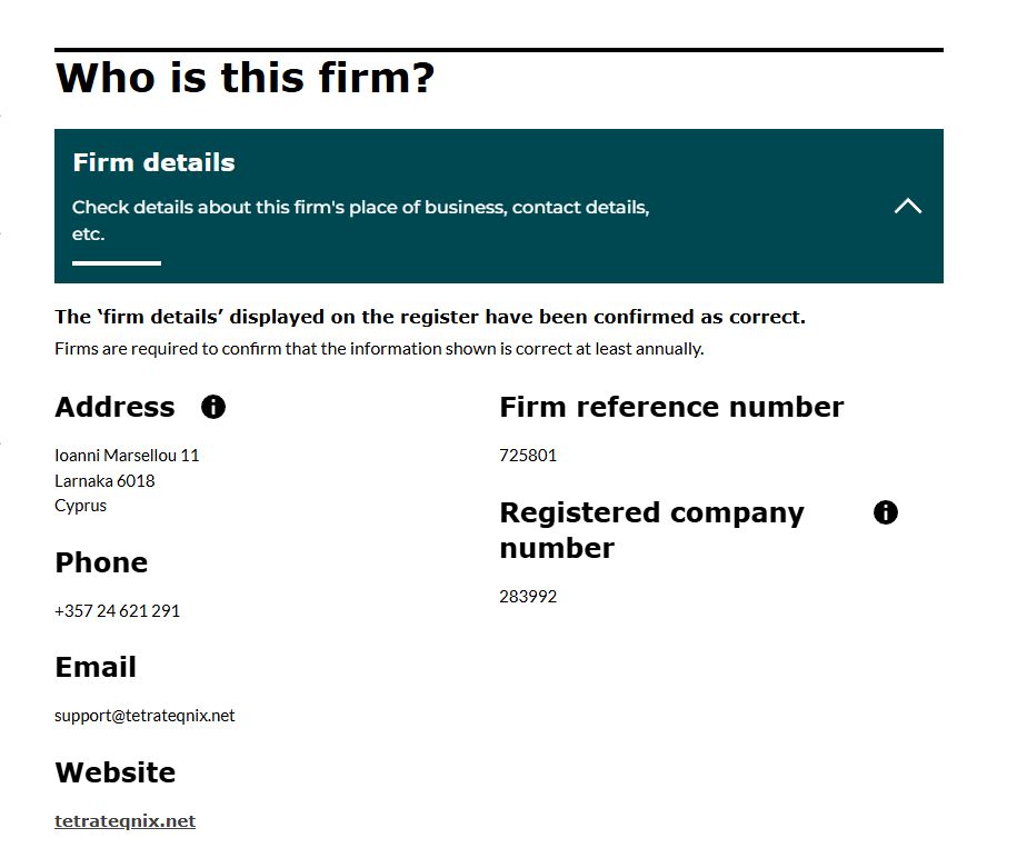 По заявлению на сайте tetrateqnix net, штаб-квартира Tetrateqnix находится на Кипре по адресу Ioanni Marsellou 11, Larnaka 6018. Также на сайте брокера опубликованы ссылки на лицензии CSSF, FCA, DFSA, VFSC и награды.
