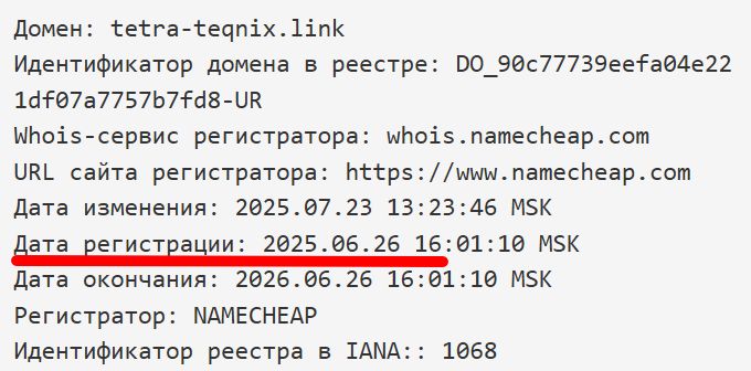 Но на этом обман не заканчивается. «ТетраТекникс» использует скрытый домен tetra teqnix link, который был зарегистрирован 26 июня 2025 года.