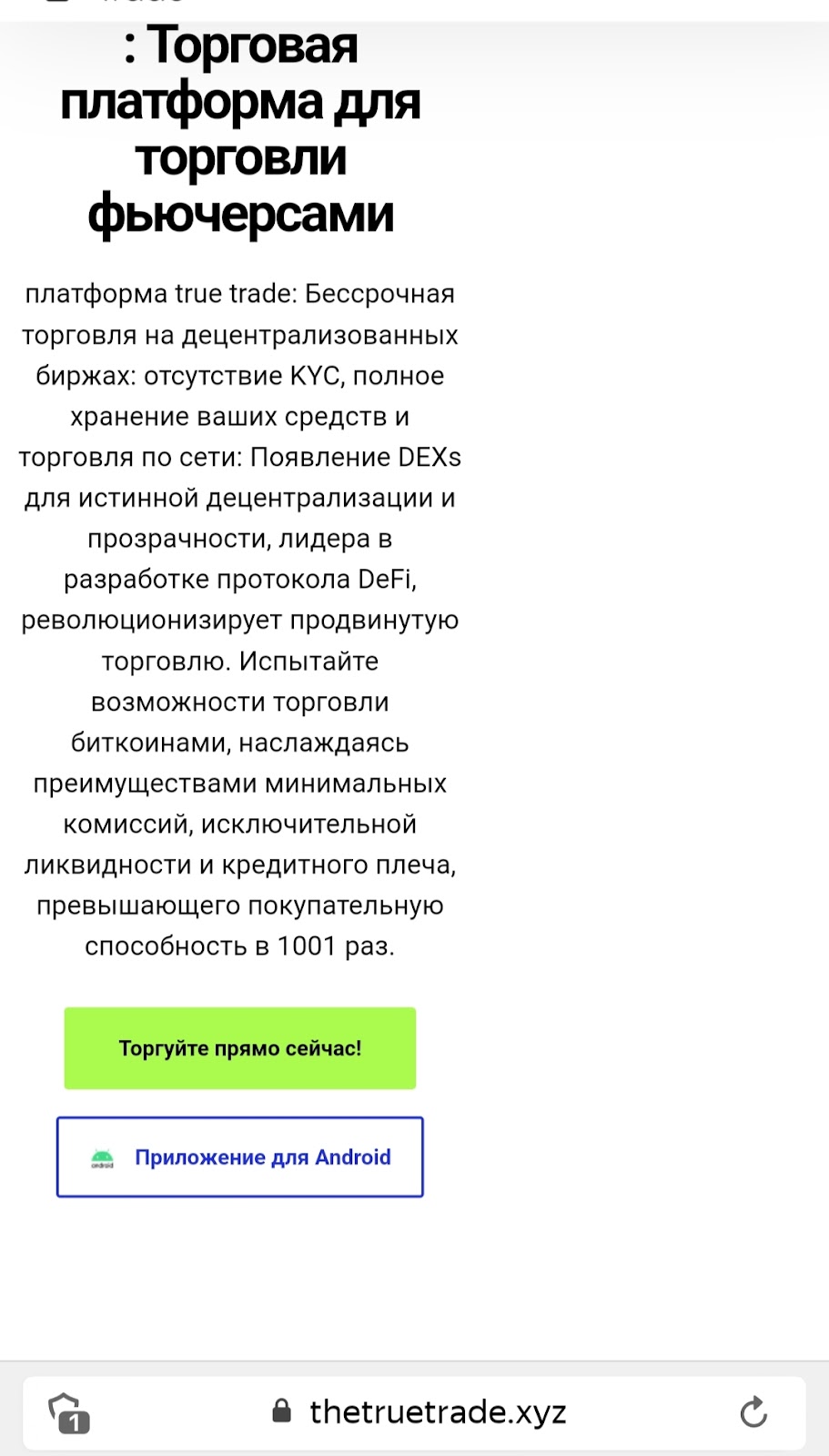 Приложение проекта The True Trade Io скачивается прямо с сайта, без гарантий его безопасности и возможности проверить на содержание вредоносных программ.
