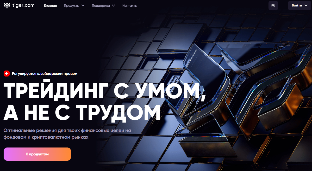 Официальный сайт TigerTrade Broker — www.tiger.com. На первом же экране есть информация, что компания регулируется швейцарским правом. Это серьезное заявление, потому что в Еврозоне очень строгие законы финансовых рынков.