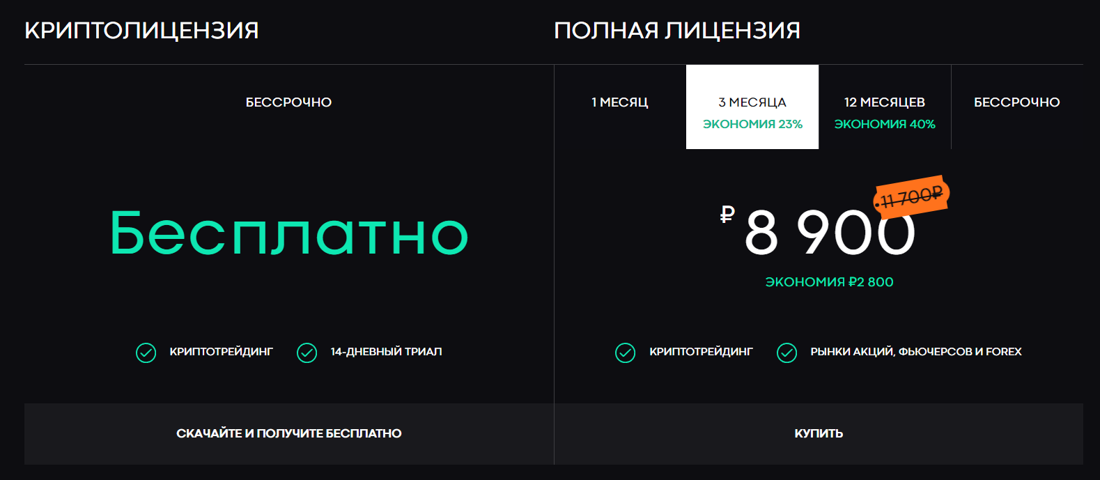Ответ на этот вопрос можно получить при переходе на страницу с продуктами. Торговый терминал бесплатный только для криптовалют. Для остальных операций придется платить. Почему такое разделение — не очень ясно.Тарифы средние. Некоторые компании просят больше, другие меньше. Цены в рублях показывают, что компания действительно работает на СНГ-рынок. Привязки к доллару или евро нет.