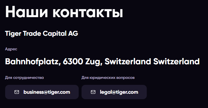 Tigertrade broker на официальном сайте предоставляет несуществующий адрес. Это второй тревожный звонок. Почты выглядят странно.
