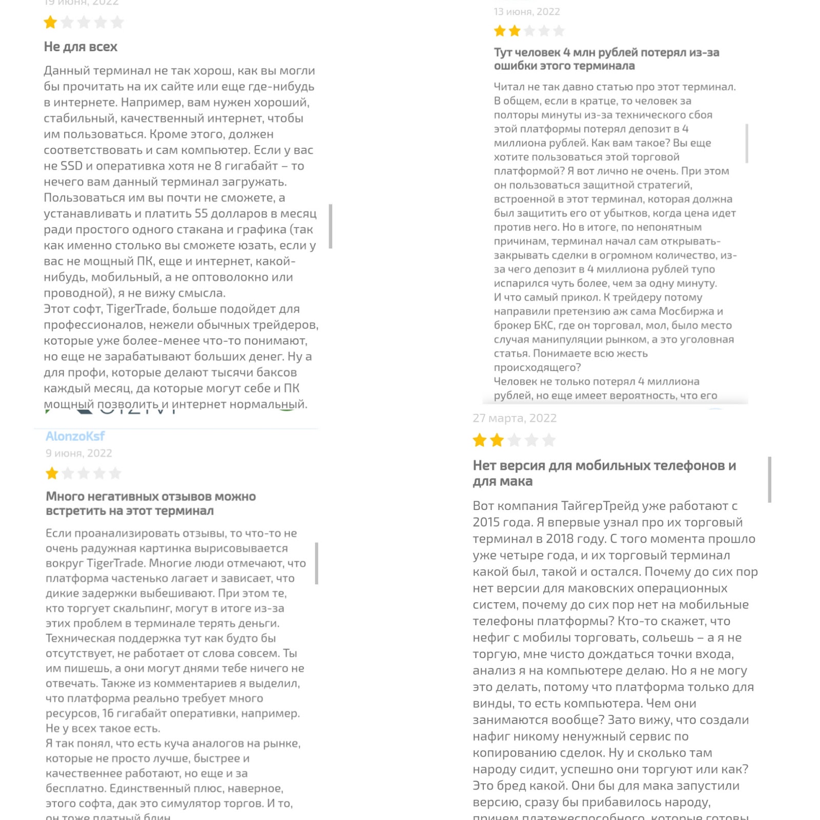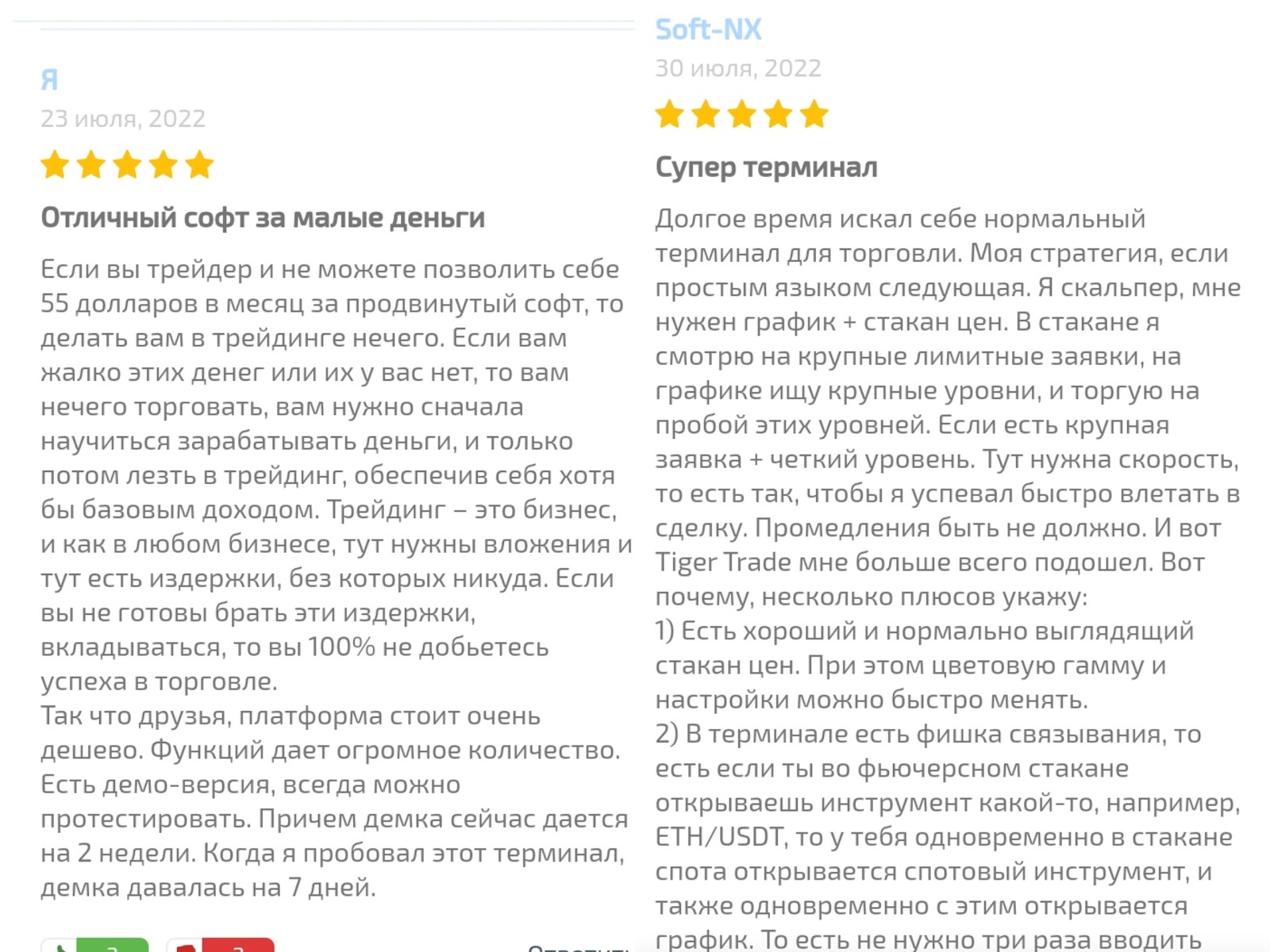 В Telegram чате и на сторонних ресурсах есть разные отклики о Broker Tiger Trade. В положительных трейдеры отмечают удобство терминала. В качестве плюсов также выделяют небольшую плату за пользование.