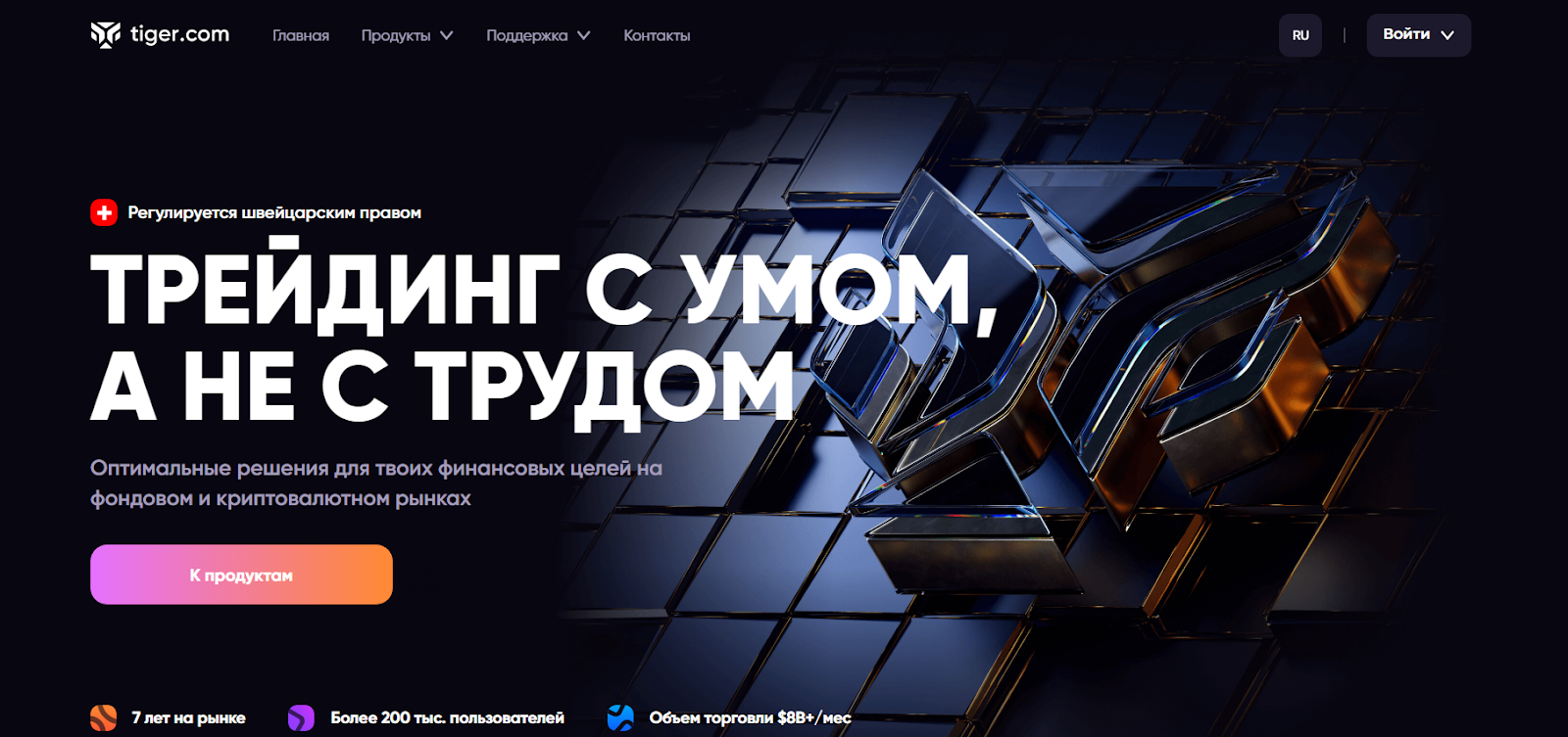 Ознакомиться с особенностями компании можно с помощью официального ресурса tiger com. Платформа доступна на нескольких языках. В их число входит русский и английский Tiger com EN. Из предложенных разделов: Главная, Продукты, Поддержка и Контакты.