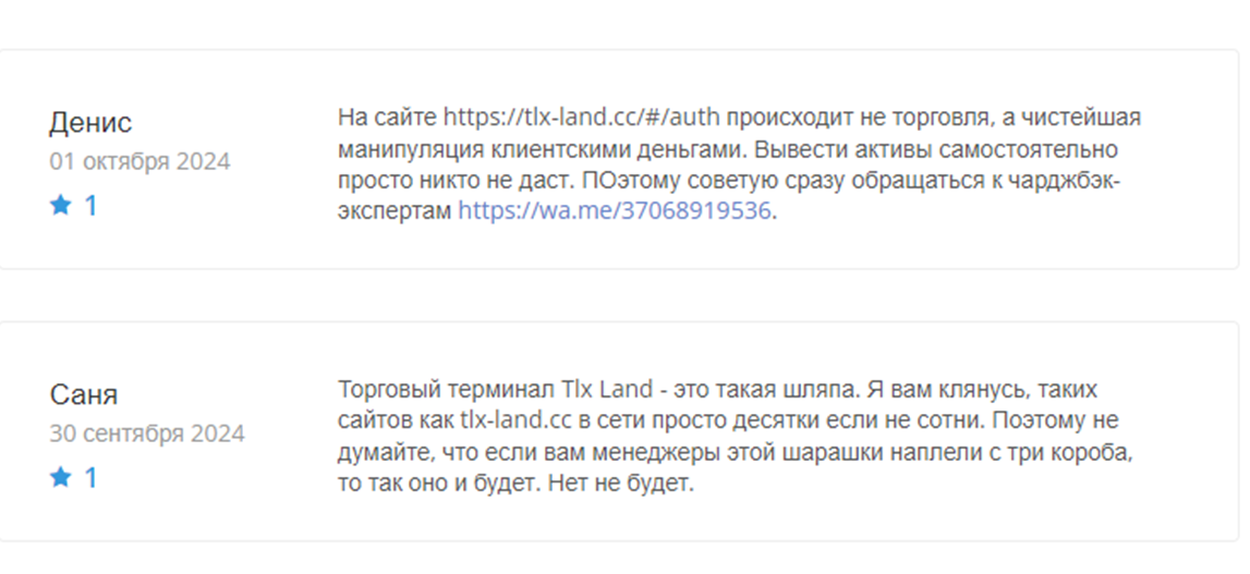 На Tlx land cc отзывов мало, но все они отрицательные. Трейдеры рассказывают, что проект мошеннический, и они потеряли деньги на данной платформе. Некоторые рассказывают, что аккаунт был заблокирован и доступ к нему, а заодно и своим деньгам, вернуть не удалось.