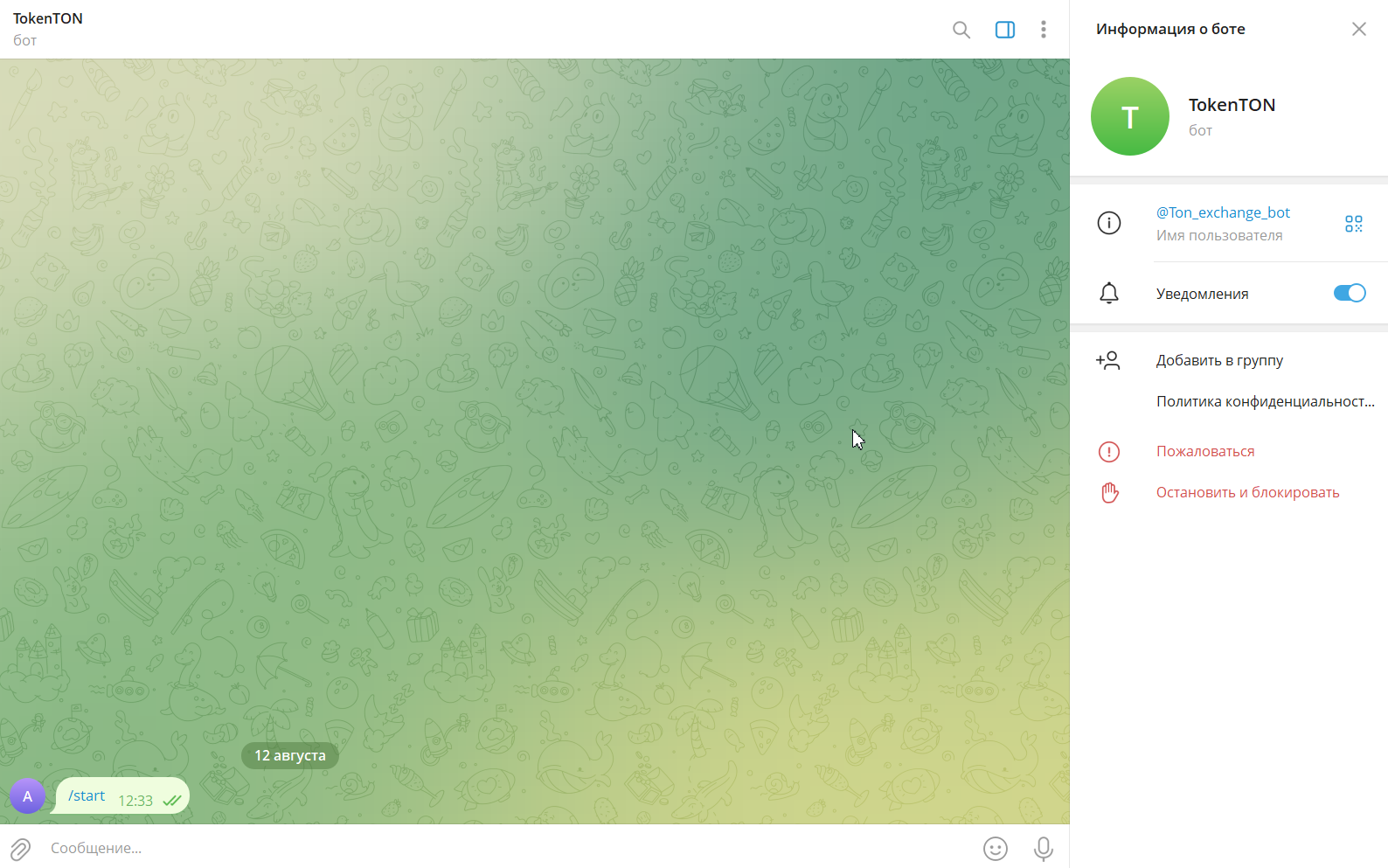 На август 2025 года Ton Exchange bot не отвечает на команды, поэтому для описания его характеристик будем использовать сохранившуюся в интернете информацию, которой оказалось не так много.