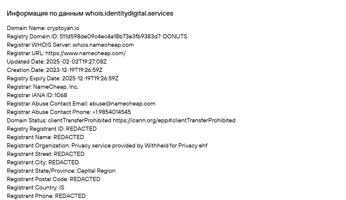 На сайте указан юридический адрес CryptoYan – Армения, а также контактные данные, включая адрес электронной почты и номер телефона. Проверка информации показала, что реально существует только номер, адрес ящика недействителен.