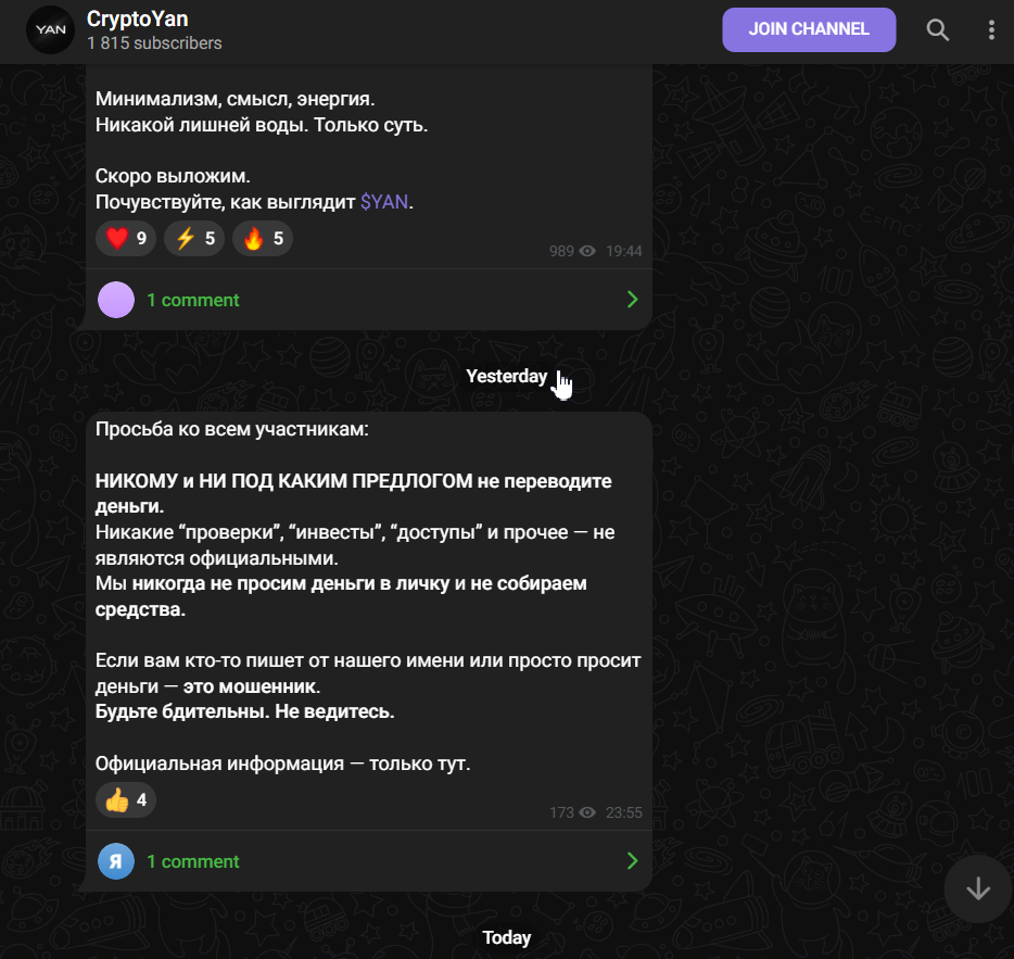 CryptoYan – это новый TON-токен для торговли. Доступ к официальному сайту блокируется интернет-провайдеров, но деятельность проекта продолжается благодаря резервному адресу и в Телегамм. В обзоре проанализируем риски и перспективы покупки актива, изучим статистику подписчиков и их активность на канале и в чате.