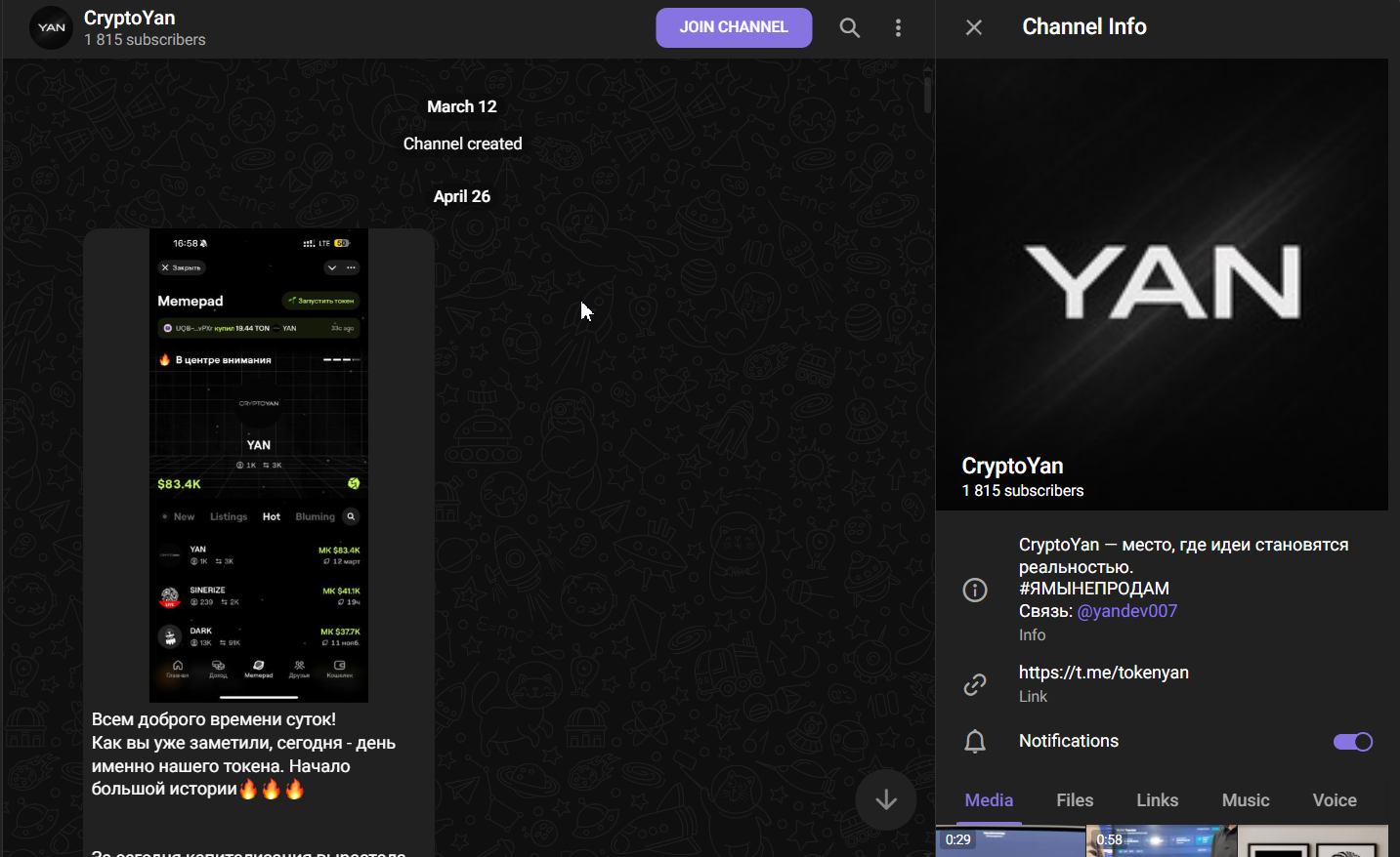 Основной телеграмм-канал проекта YanBot Your AI Trading Companion был зарегистрирован в марте 2025 года, но первая запись появилась только спустя почти полтора месяца. Первая запись CryptoYan посвящена капитализации, а точнее её росту в отметку в 100000. Создатель канала YanDev007 оповещает, что каждую минуту коин покупают минимум на 100 тон.