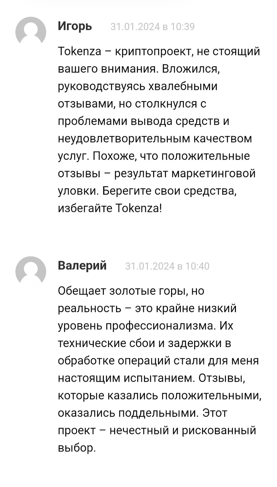 Сразу двое пользователей сошлись во мнении о неблагонадежности проекта “Токенза”.