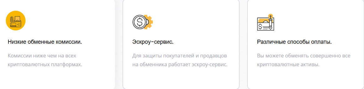 На сайте упоминается низкая комиссия, экроу-сервис и различные способы оплаты, что подается как «уникальное условие». В действительности это средний показатель для аналогичных сервисов и не является конкурентным преимуществом.
