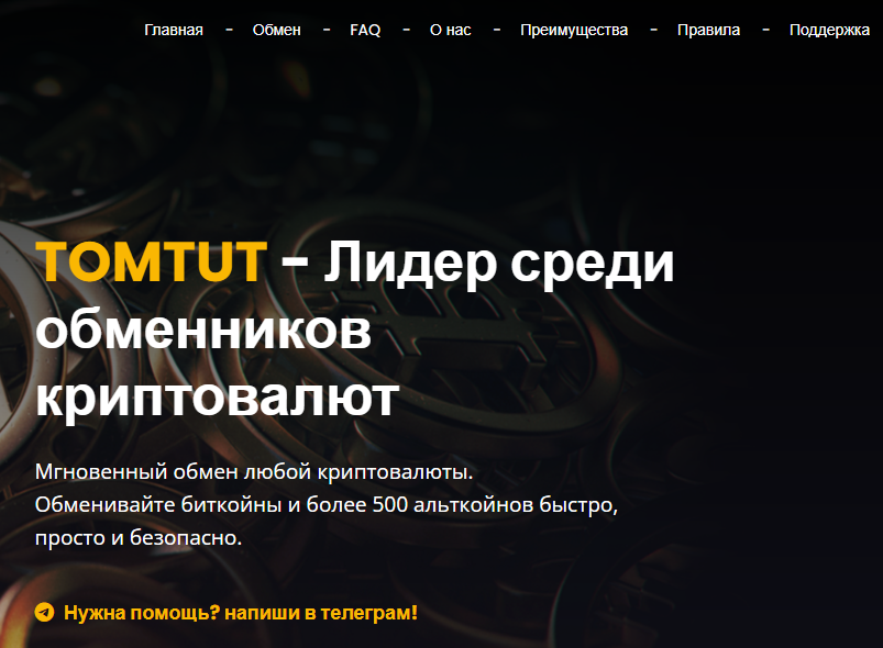 TomTut com – это онлайн-обменник, на сайте которого заявлены мгновенные операции с токенами и рублями. Вся информация о проекте размещена на одностраничном сайте с минимальным оформлением.
