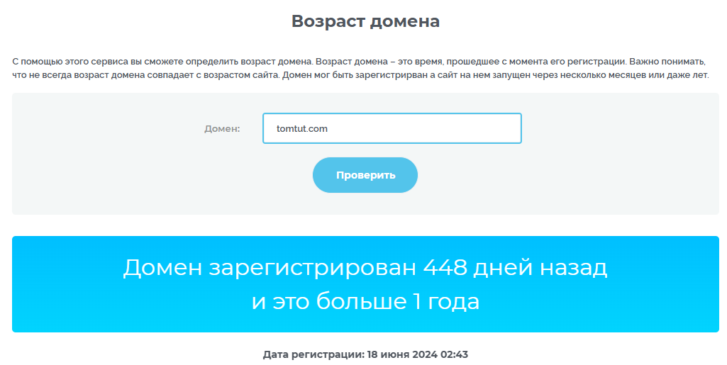 Проверка домена показала, что он был зарегистрирован только 18 июня 2024 года. Таким образом, заявления на сайте TomTut о «пятилетнем опыте» не соответствуют действительности.