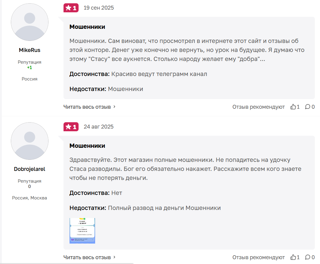 Сомнения в том, что сообщения от пользователей в канале фейковые, возникают также при анализе отзывов на сторонних источниках, ведь положительных мнений никто не высказывает. Пострадавшие называют владельца мошенником, потому что перевели ему деньги, а в ответ получили только блокировку.