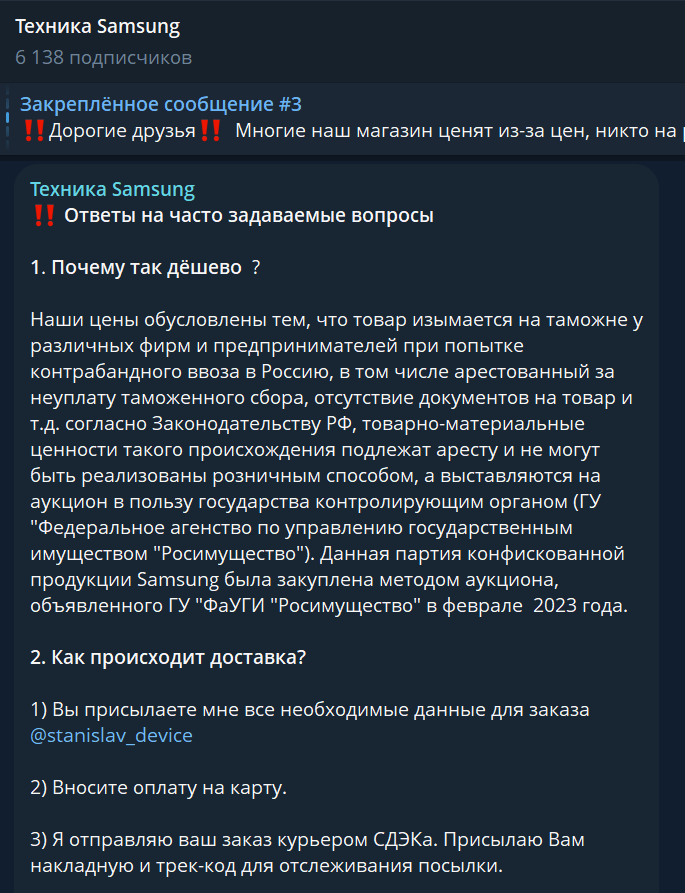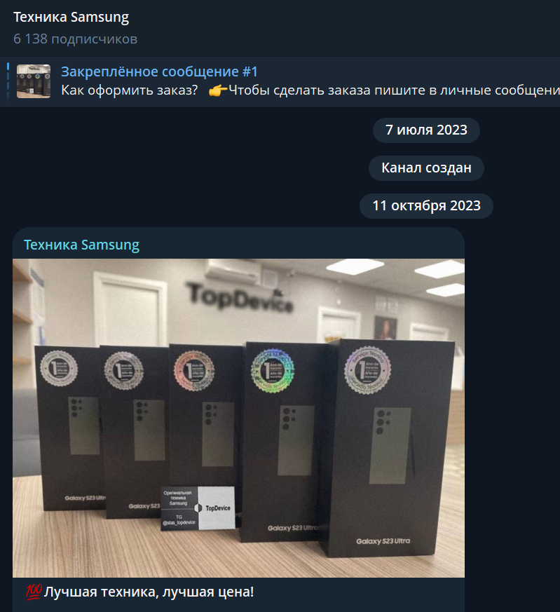 На канале в Телеграмм предлагают купить технику «Самсунг» по низким ценам, а владелец говорит, что такое стало возможным благодаря изъятию товаров на таможне. В постах можно увидеть название магазина «ТопДевайс», где действительно продают продукцию от «Самсунг» и других производителей, но нет никаких подтверждений, что канал TopDevice Samsung как-то с ним связан.