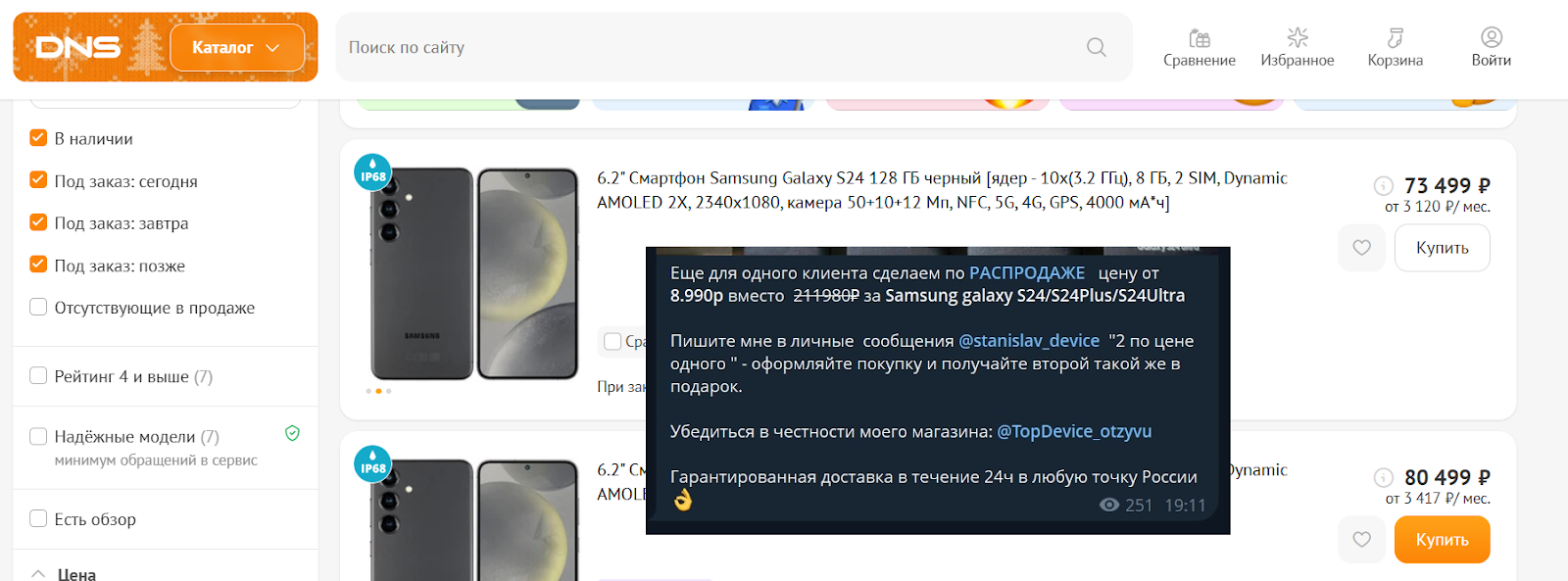 Для примера, на сайте Dns в декабре 2025 года телефон Samsung Galaxy S24 стоит ₽73,000, а на канале ₽9,000, причем предыдущий ник владельца Stas_TopDevice удален.