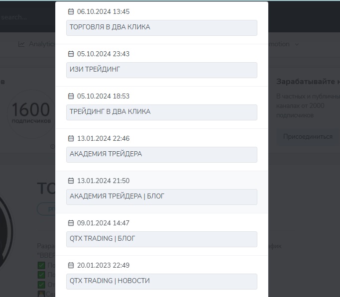 Паблик в Телеграм Торговля В Два Клика создан еще в 2020 году, но его история за два года удалена, активность начинается с 23 июля 2022 года. Названия за это время менялись 9 раз в такой последовательности: Академия Трейдера — QUOTEX TRADING Новости — QTX TRADING Новости — QTX TRADING Блог — Академия Трейдера Блог — Академия Трейдера — Трейдинг В Два Клика — Изи Трейдинг и с 6 октября 2024 он стал Торговля В Два Клика.