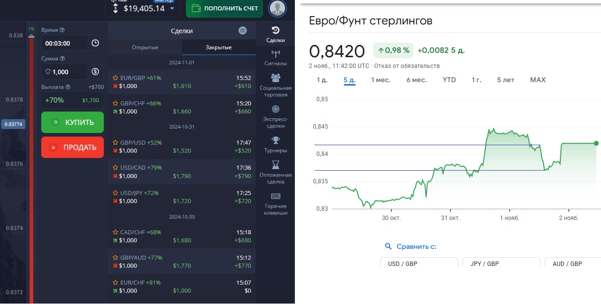 Чтобы подтвердить эффективность прогнозов, владелец Trade2click размещает скрины с якобы рабочей платформы, где демонстрирует неизменно высокую доходность. Мы проверили эти показатели, они вполне правдоподобны. Например, в сделке от первого ноября, админ указывает, что заработал на падении курса евро/фунт стерлингов. На этом временном диапазоне, действительно было движение вниз, оно длилось всего несколько минут и надо было сделать ставки моментально.