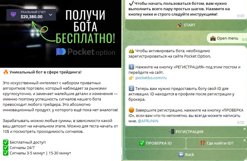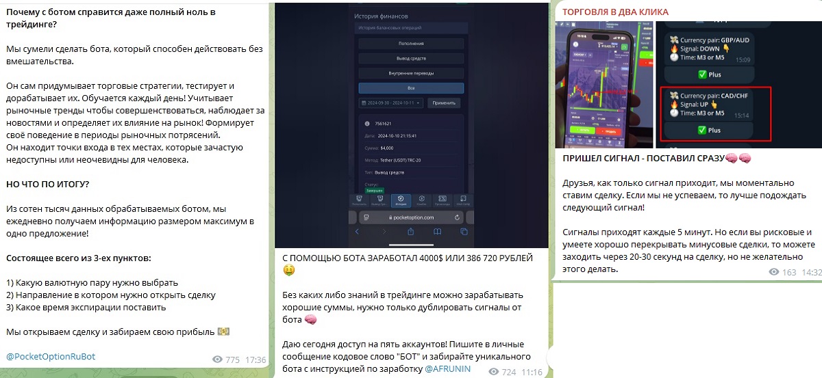 Проверка показала, что чудо-бот PocketOptionRuBot, который продвигает админ канала Торговля в Два Клика — это очередной скам-проект для развода начинающих трейдеров. Здесь зарабатывает только владелец, на процентах, которые ему выплачивает брокер за слитый депозит рефералов.