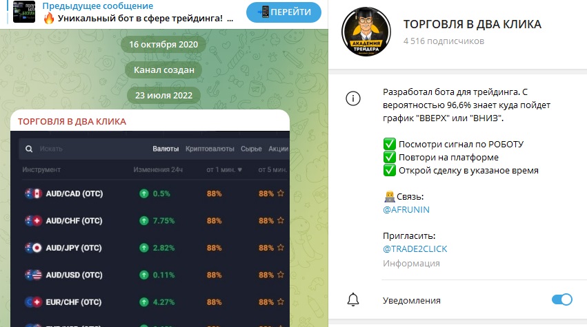 Проект в Telegram Торговля В Два Клика, отзывы о котором пока отсутствуют, предлагает высокие заработки на бинарных опционах с помощью сигналов от бота. Разработчики уверяют, что PocketOptionRuBot выдает их с точностью 96,6%. Можно ли верить таким обещаниям, какая реальная проходимость сигналов и кто на них зарабатывает — ответы на эти вопросы вы получите в обзоре.