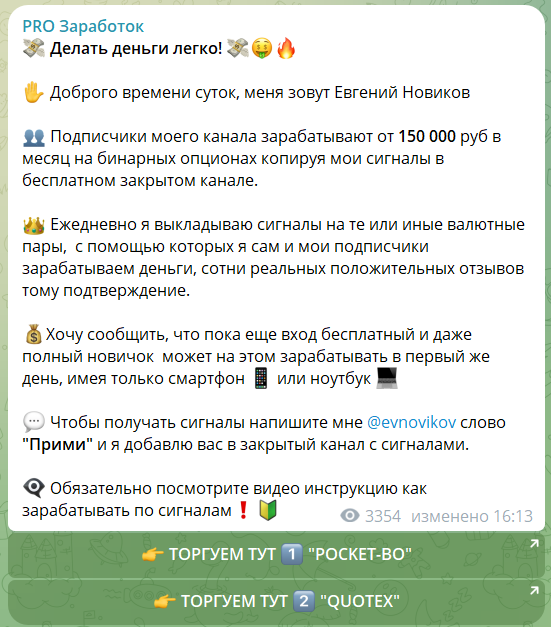Свою работу по разводу населения Евгений Новиков в Телеграм продолжал под ником evnovikov на канале “PRO заработок”.
