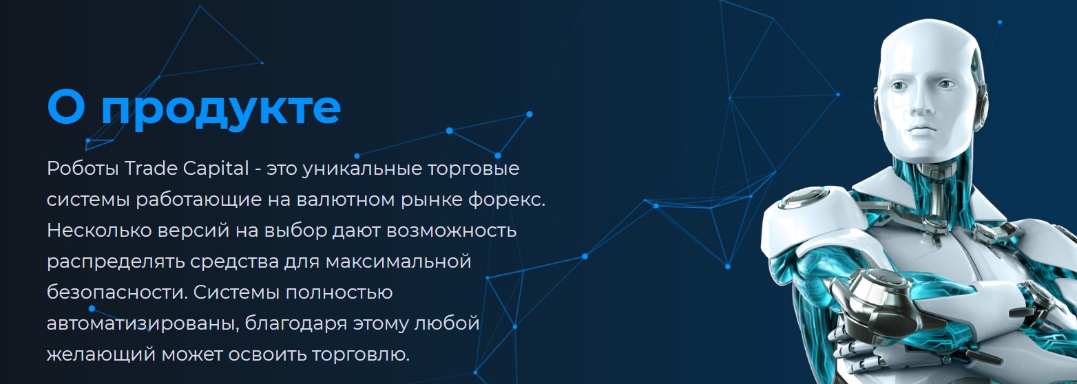 Trade Capital является действующим брокером, сравнительно недавно появившимся на рынке. На своем официальном сайте он предлагает покупку роботов для торговли на бирже. Нами была изучена деятельность компании Трейд Капитал и предлагаемое платное обеспечение. О том, стоит ли покупать торговых советников или лучше воздержаться от сотрудничества с проектом, читайте в нашем обзоре.