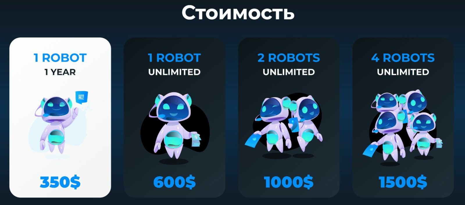 - безлимитный доступ к 4 роботам обойдется 1 500 долларов.