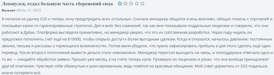 В интернете уже встречаются отзывы об Egscap com и EGS Capital Limited, все они негативные. Клиенты утверждают, что теряли вложенные депозиты, а от поддержки добиться помощи не получается.