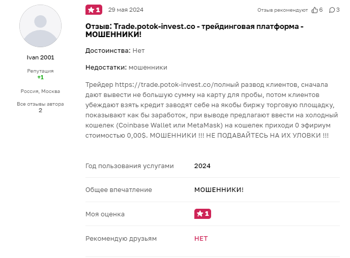 Трейд Поток Инвест — очередная скам платформа, которая обещает наивным инвесторам помощь в торговле, но перестает отвечать на запросы сразу же после пополнения счета. Минусы брокера: