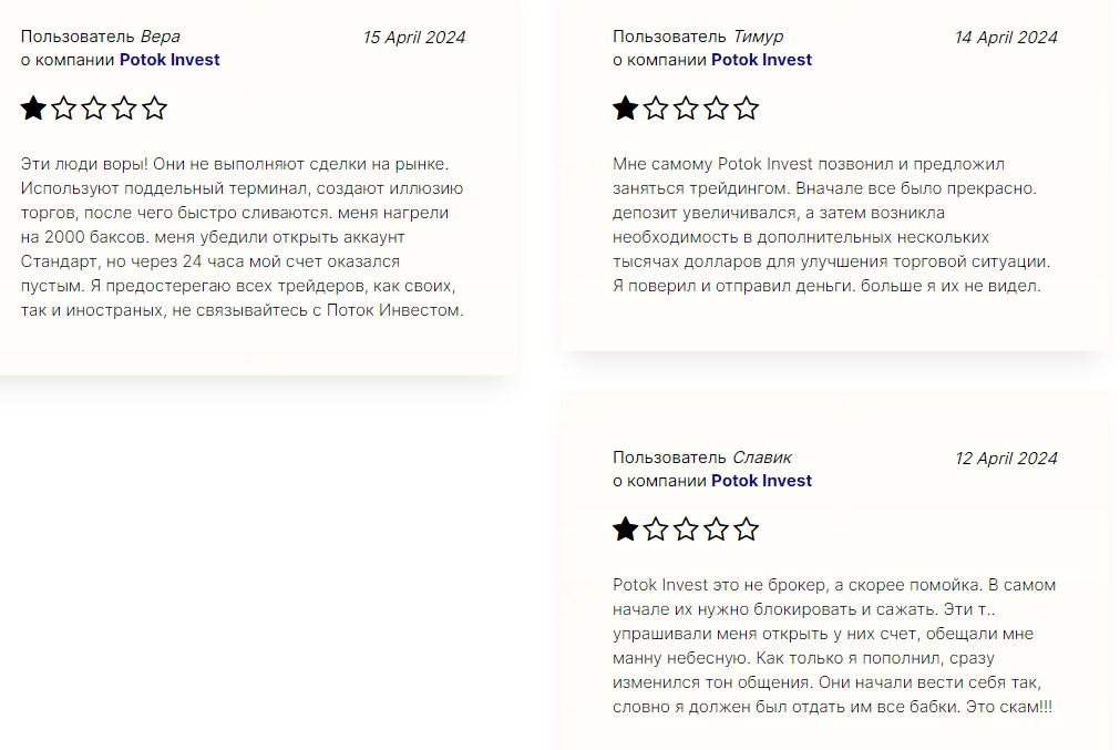 Отзывы о Trade Potok Invest co исключительно негативные. Все пользователи утверждают, что это мошенники, которые не выводят средства клиентов, сливают их депозиты. Сайт сырой, никакой торговли на нем нет и быть не может, так как у конторы нет поставщиков ликвидности и подключения к рынку ценных бумаг. Поддержка работает отвратительно, может не отвечать неделями. Клиентам блокируют кабинеты без объяснения причин.