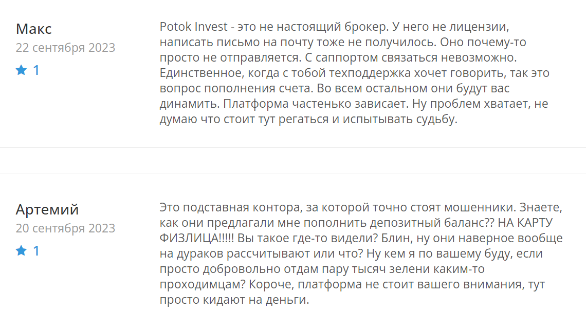Trade Invest Potok — это мошенническая платформа. После пополнения счёта поддержка исчезает, вывести деньги невозможно. Сайт сырой, лицензии и регистрации нет. Рекомендую держаться подальше от этого проекта.