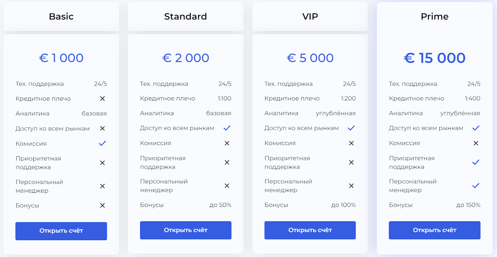 - Тариф Prime — минимальный взнос 15 000 евро, леверидж 1:400, приоритетная поддержка, персональный менеджер и бонус до 150%.