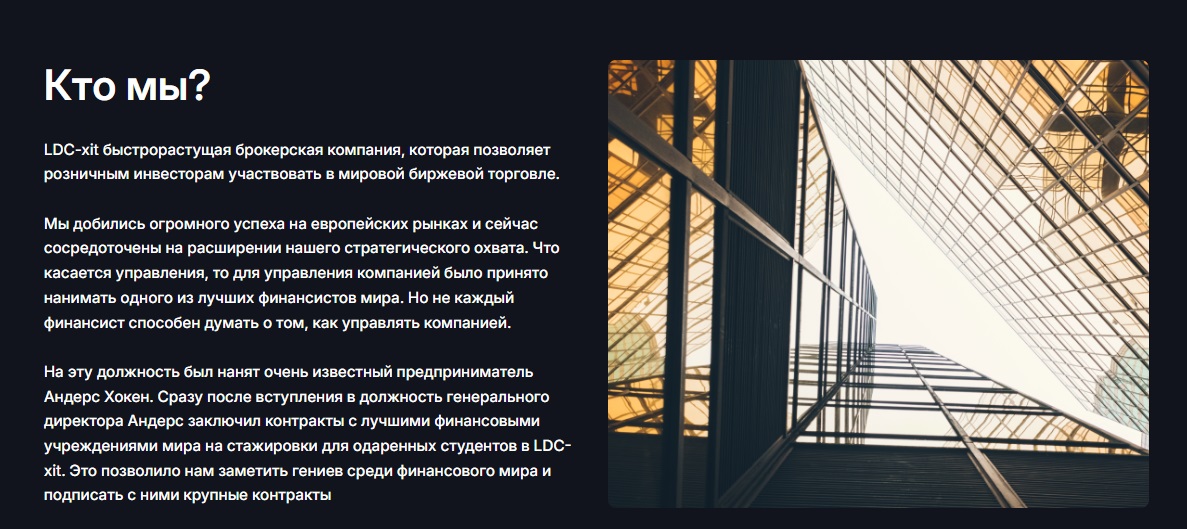 Компания ЛДСхит трейд, со слов владельцев, занимает лидирующие позиции на международном рынке, ее президент — известный финансист Андерс Хокен, а все сотрудники — “гении финансового мира”. Но проверка показала, что о брокере или бирже LDC xit (Ldcxit), как и о ее руководителе, нет никакой информации на зарубежных ресурсах.