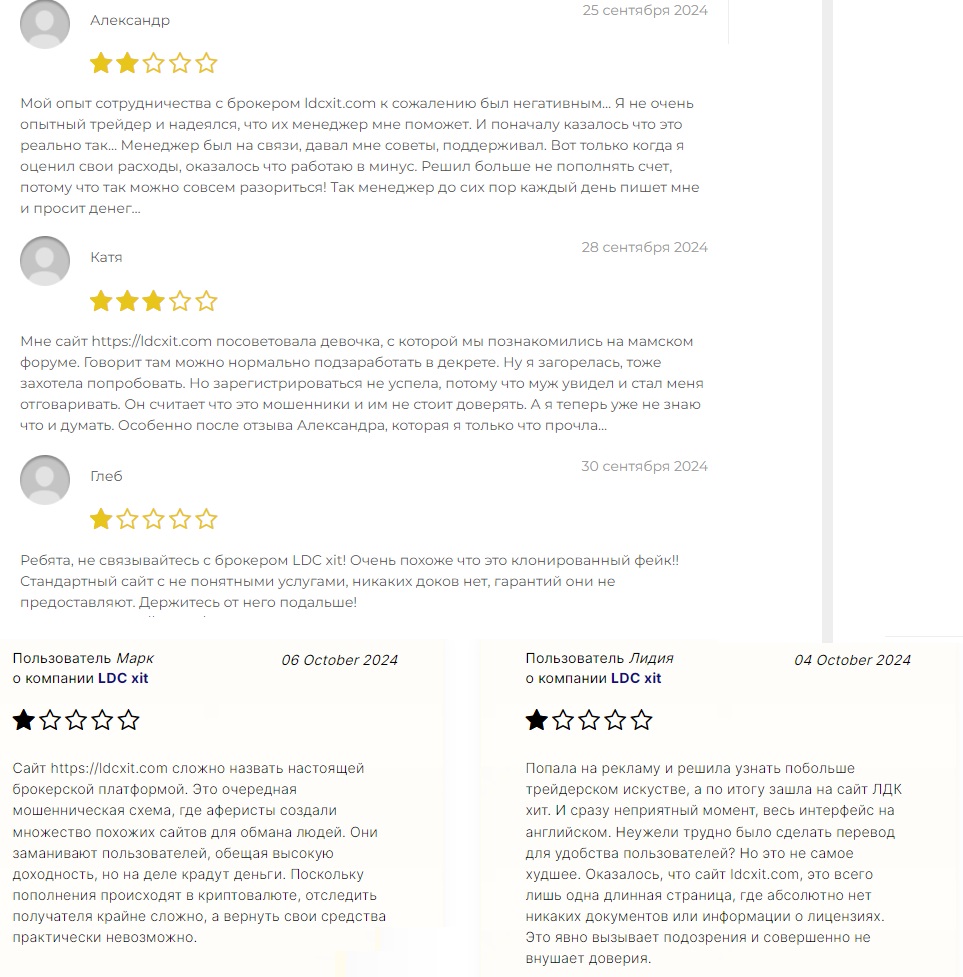 О компании LDC xit и торговой платформе Trade LDCxit com отзывы уже появились в сети, все они на негативе. Экс-клиенты рассказывают, что на сайт попали по приглашениям из соцсетей с обещаниями высоких заработков. Никаких выплат не получили, после требования ввода их аккаунты заблокировали. Большинство пользователей утверждает, что LDCxit com скам