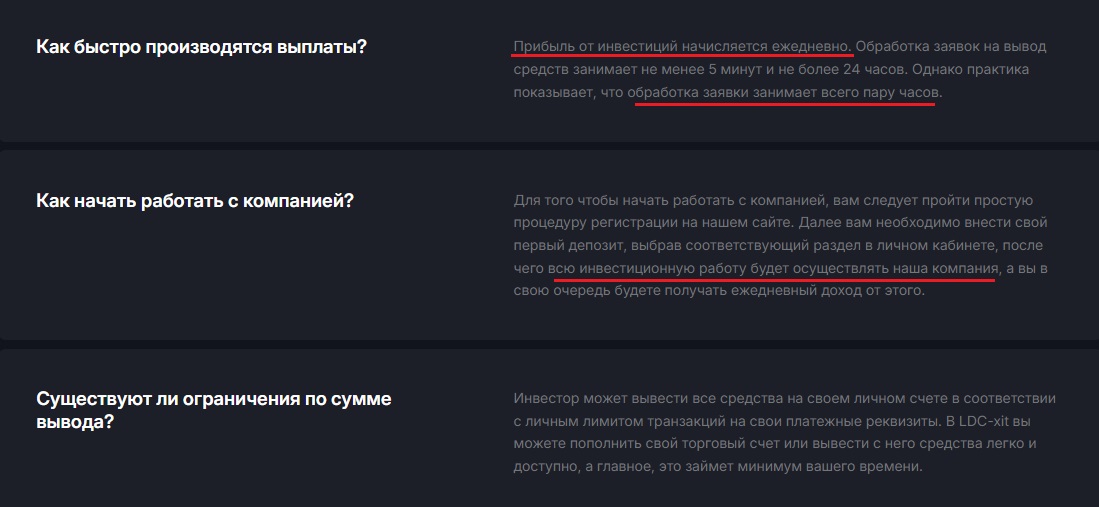 Поскольку LDC xit — брокер, то у него есть свой торговый терминал, через который, со слов разработчиков, можно получить доступ к самым востребованным рынкам для самостоятельного трейдинга. Но ту же они противоречат себе — в описании условий указано, что от клиента требуется только пополнение счета, всю остальную работу берут на себя сотрудники конторы. Начисления по инвестициям обещают проводить ежедневно.