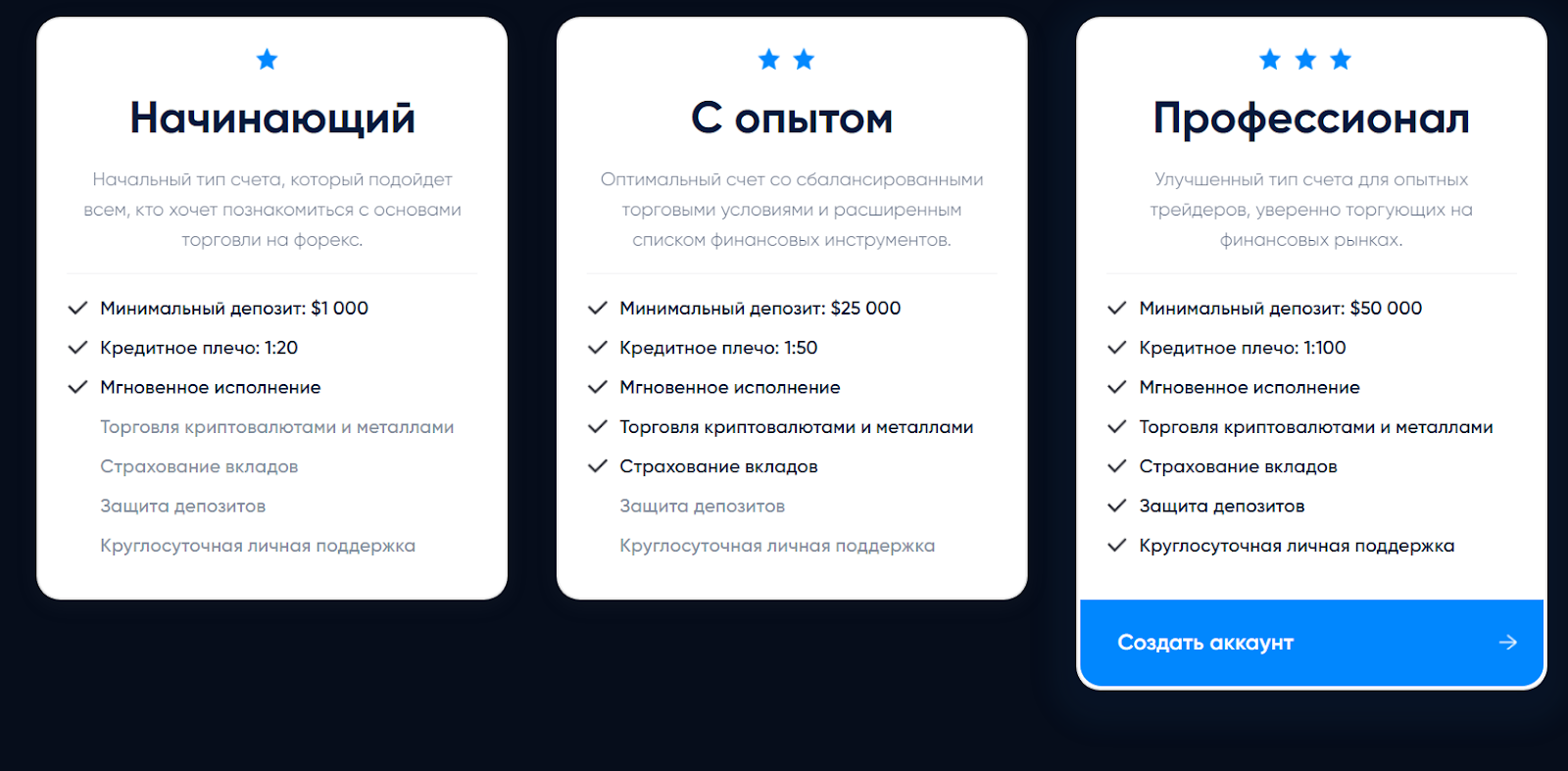 Компания дает возможность заработать на валютном рынке, драгоценными металлами, индексами, сырьем, криптовалютой и акциями компаний, а выбрать подходящие условия можно по предложенным платежным счетам: