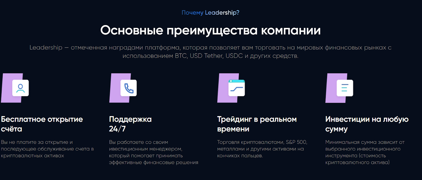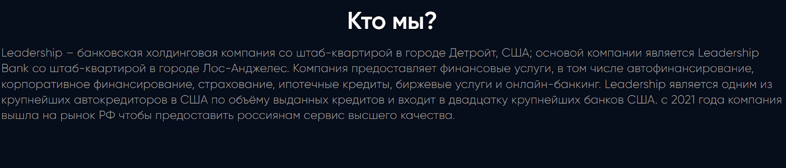 • на сайте брокера нет возможности изучить терминал с помощью торговли на демосчете, нет лицензий и достижений, сертификатов, отсутствует информация о комиссиях, а платежные счета очень дорогие, поэтому торговать на бирже Leadership будет крайне невыгодно;